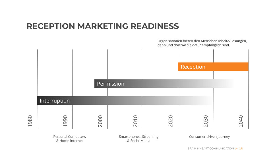 Definition: Reception Marketing löst das traditionelle Interruption und Permission Marketing ab. Es basiert auf Big Data, Algorithmen und Künstlicher Intelligenz, um Inhalte exakt dann und dort auszuspielen, wenn die Nutzer:innen dafür empfänglich sind.